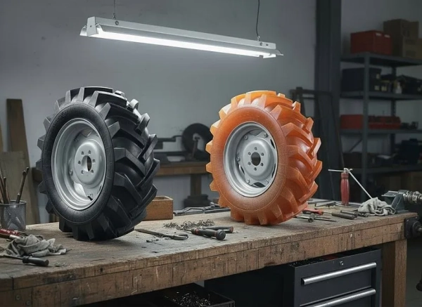 Полиуретан стоит дороже и со временем начинает крошиться, однако он легкий, механически прочный, химостойкий (в отличие от резины) и жесткий, что снижает амортизационные свойства, но практически не ограничивает проходимость.